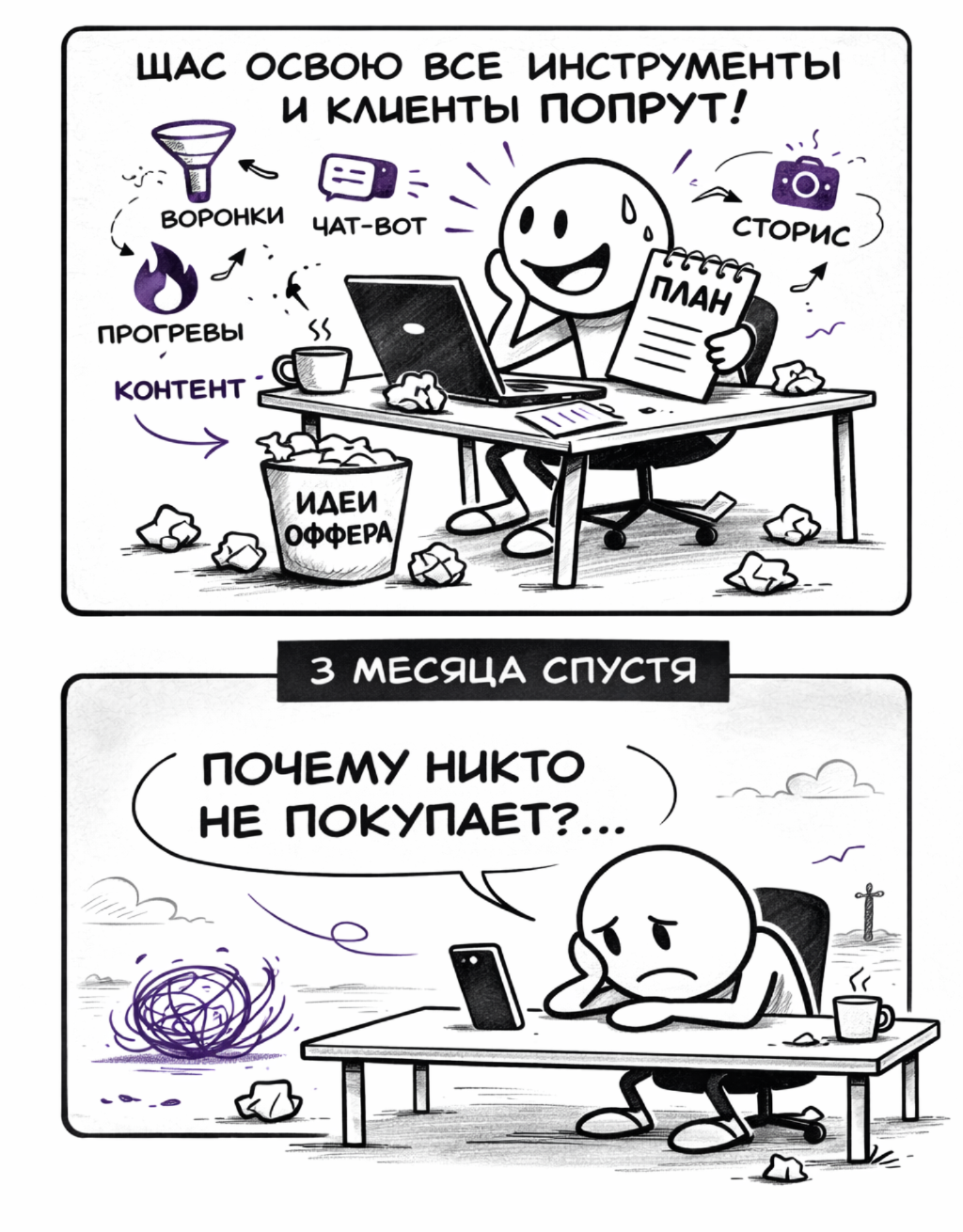КП, сайт, посты, сторис, переписки, созвоны... Один раз сделали —
