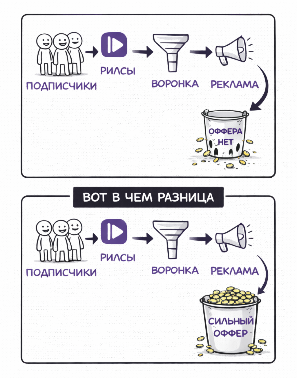 Все эти инструменты: воронки, контент, реклама лишь УСИЛИВАЮТ и МАСШТАБИРУЮТ ваш оффер!